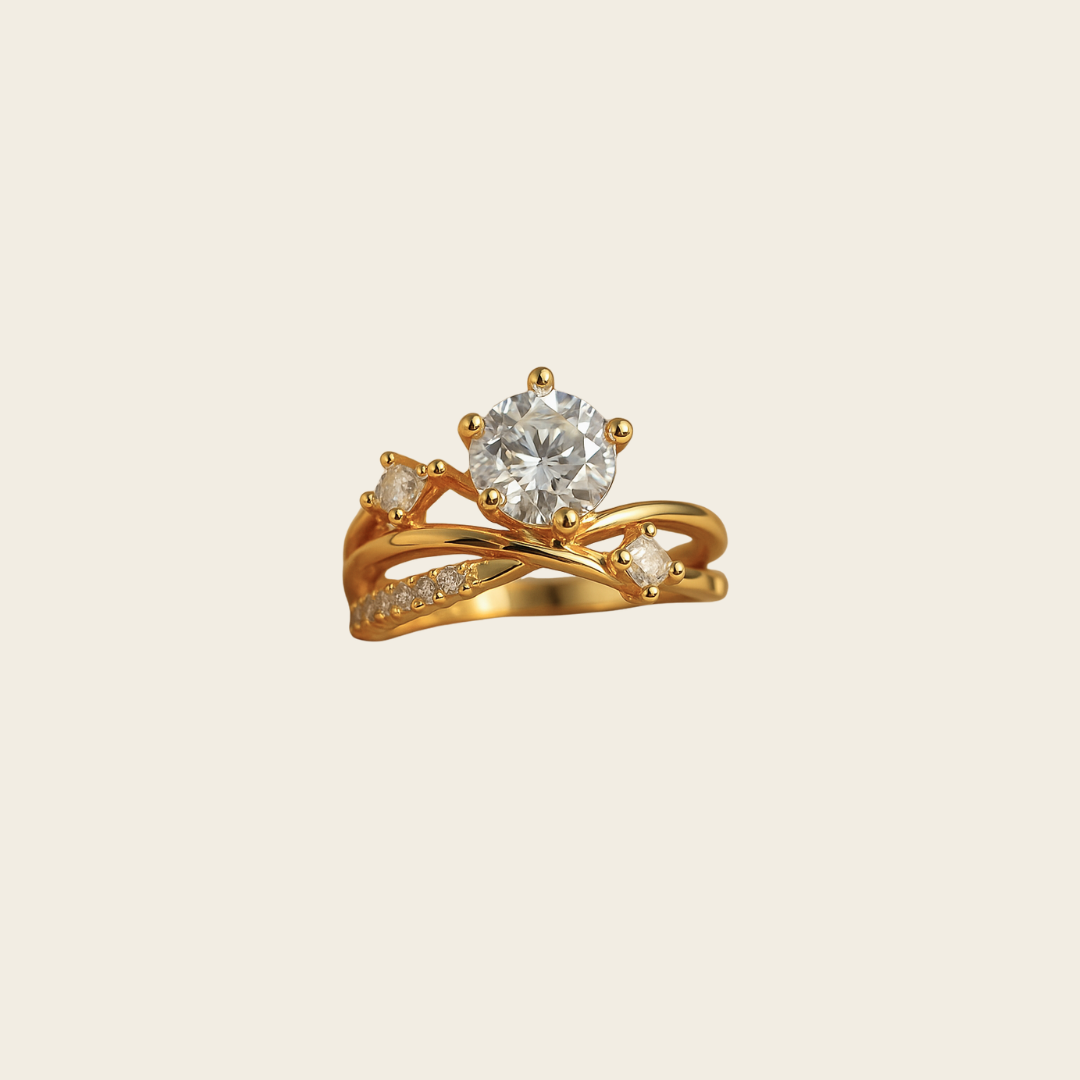Una circonita central tipo sol o estrella se eleva entre dos bandas doradas: una lisa y otra engastada con pequeñas piedras que evocan constelaciones.