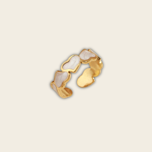 El Anillo Nubes de Corazón enamora con su fila de corazones blancos nacarados que brillan sutilmente sobre la base dorada.