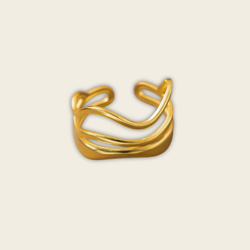Onda Libre es un anillo escultural que juega con líneas curvas y vacíos, creando un efecto visual de movimiento y ligereza.