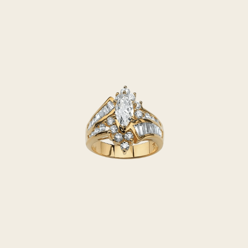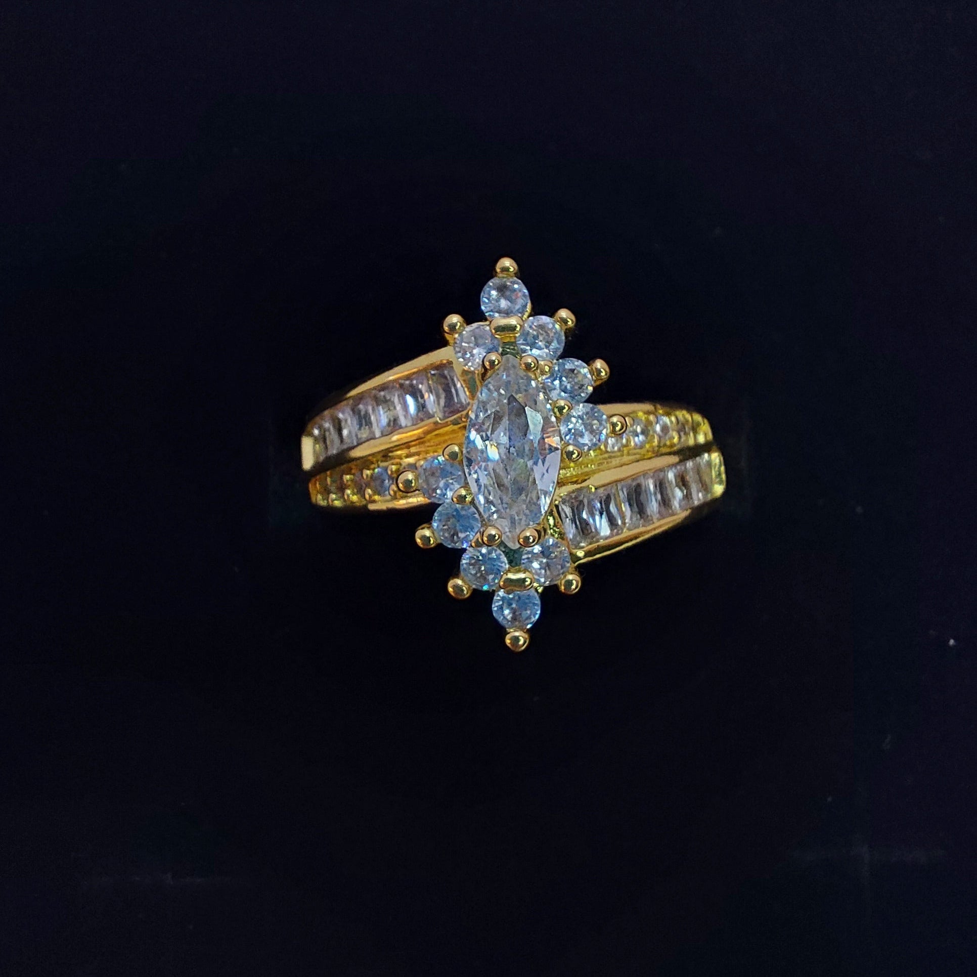 El Anillo Reina Marquise deslumbra con su circonita central en corte oliva, enmarcada por un halo de pequeñas gemas brillantes. La doble banda dorada, completamente engastada, aporta fuerza visual y sofisticación a una joya que no pasa desapercibida.