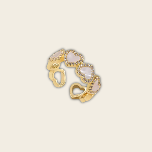El Anillo Sweet Glow está elaborado en plata de ley 925 bañada en oro de 14K, con una delicada fila de corazones esmaltados en blanco y rodeados de circonitas que capturan cada destello.