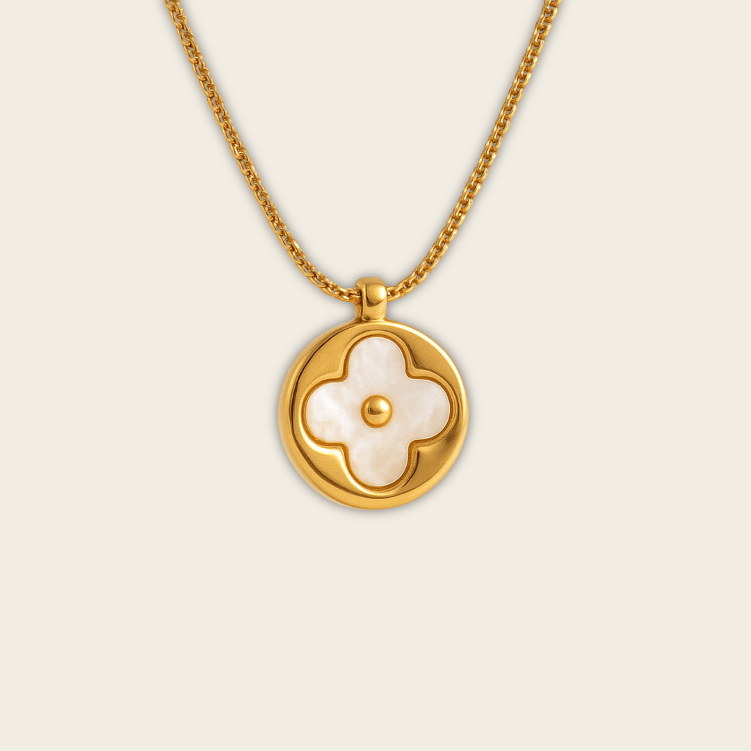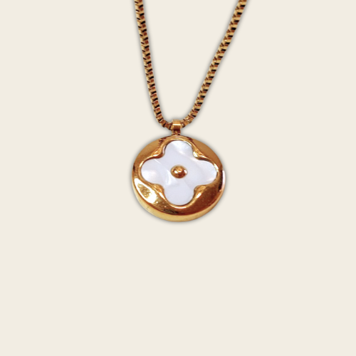 El Collar Resplandor Eterno está elaborado en acero inoxidable con baño dorado, un material resistente, antialérgico y duradero que mantiene su brillo con el uso diario. Su dije redondo esmaltado en blanco con diseño floral crea una pieza delicada y versátil. La cadena de eslabones finos aporta elegancia y firmeza, convirtiéndolo en el accesorio perfecto para acompañarte tanto en el día a día como en ocasiones especiales.