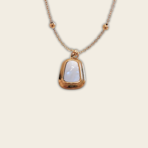 El Collar Lumen Blanco está elaborado en acero inoxidable con baño dorado, un material resistente, antialérgico y duradero que conserva su brillo con el uso. Su delicado dije geométrico con centro esmaltado en blanco nacarado cuelga de una fina cadena adornada con pequeños detalles esféricos, aportando movimiento y sofisticación.