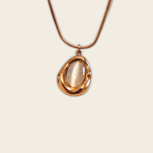 El Collar Lumen Dorado está elaborado en acero inoxidable con baño dorado, un material resistente, antialérgico y duradero que mantiene su brillo con el uso. Su dije ovalado en acabado dorado pulido con centro nacarado crea un contraste sofisticado y llamativo. La cadena tipo serpiente aporta firmeza y un brillo uniforme que realza cualquier outfit, desde lo casual hasta lo formal.