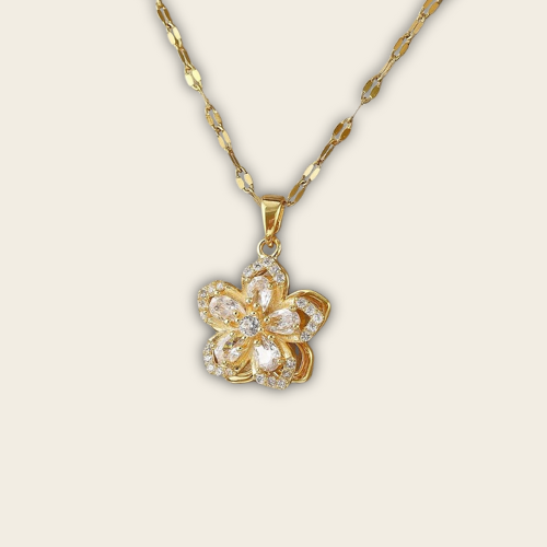El Collar Virelia destaca por su diseño encantador y original: una flor de cinco pétalos con circonitas blancas que puede girar sobre sí misma, aportando dinamismo y elegancia.